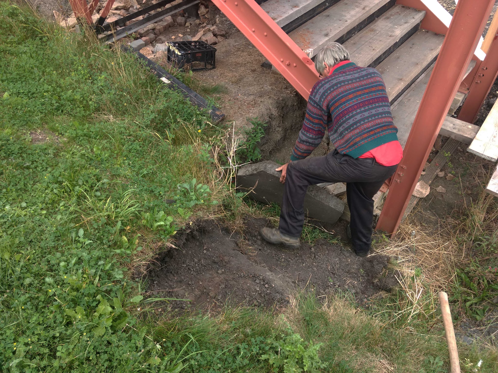 We're not quite happy with the immediate terrain surrounding the steps, and might dig it back a little. One of the things that's been staring at us is this original Broadway slab, one of many that were collected during the demolition, then bulldozed over up the slope. It's broken, but still heavy. The best way to deal with it is to use it as fill, so Neal rolled it into the pit. It was covered, under the grass, by about 9 ins of ash, so the original ground level here, before demolition, must have been that much lower.