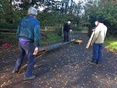 Neal is a wizzard as far as kit is concerned, so when the bottom refused to budge, he got out a cable with a ratchet, connected the bottom of the post with the trunk of the tree, and applied tension. With the weight of yours truly and John on the top end, it suddenly shot out of the ground, to reveal two timbers underneath, attached with rusty bolts.