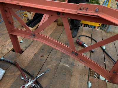 We were particularly keen to get lots of rivets in here because this area will be in full sight of the public, but of course rivets in place also give the whole structure much more stability than nuts and bolts. One or two places will have to have bolts as we can't get the guns in due to tight angles, and those bolts will be secured with Nyloc nuts. Nuts can shake loose over time. In fact, tightly secured nuts shook quite loose when we let off two rivet guns in the spot next door!