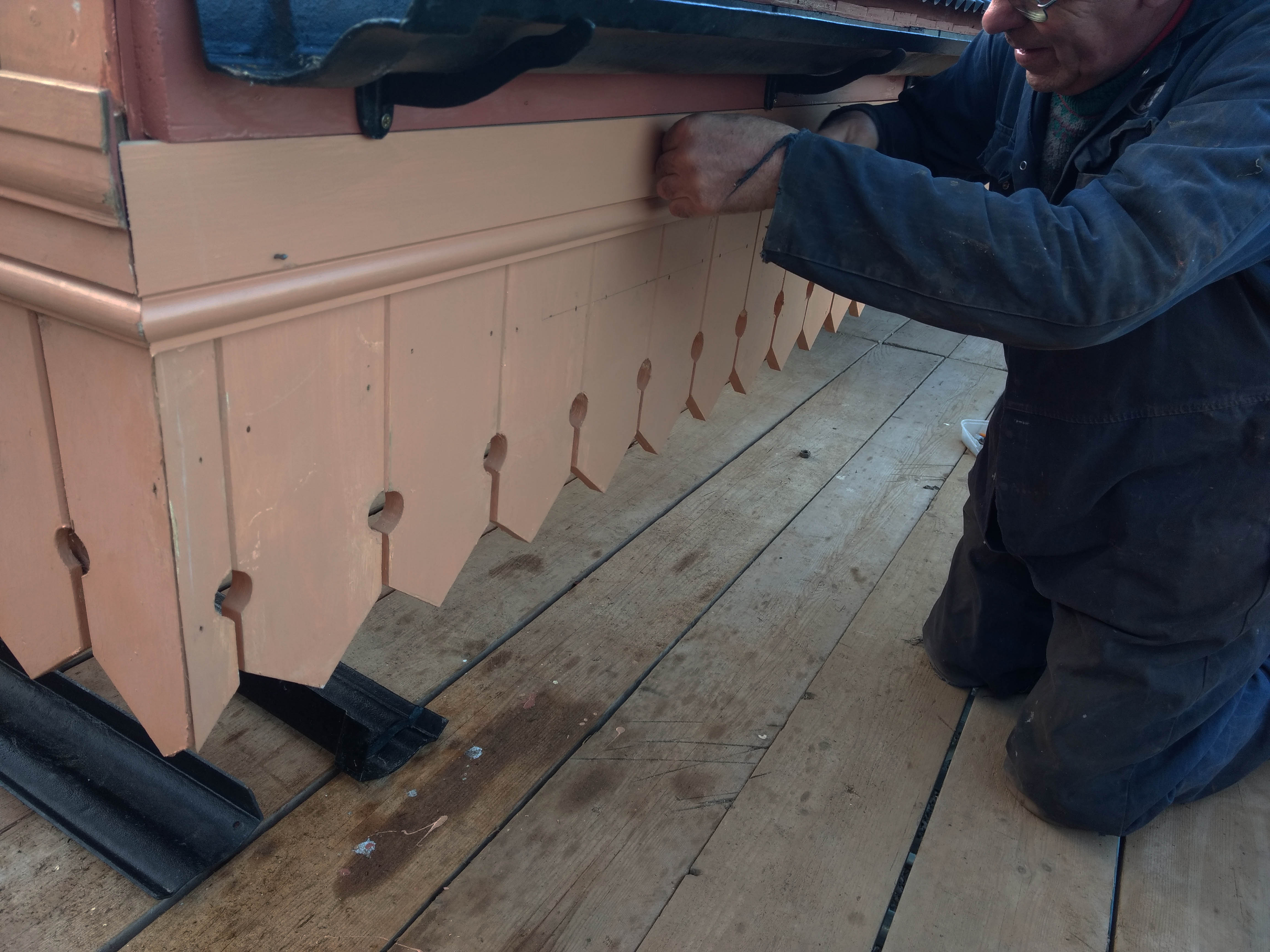 The whole of the end, as well as the daggers and mouldings on the two sides, were undercoated in light stone by yours truly today.