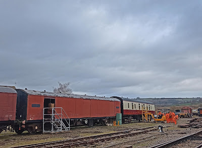 Unusually, the PWay gang was not out along the line today (no doubt caused by the after effects of an extensive PWay Christmas dinner at a local hostelry yesterday) but busy in the yard. The PWay train has had its consist changed, and a new position has been found for it, so that it does not keep moving a few feet every now and then. It now has a new home in the siding leading up to the Usk platform.